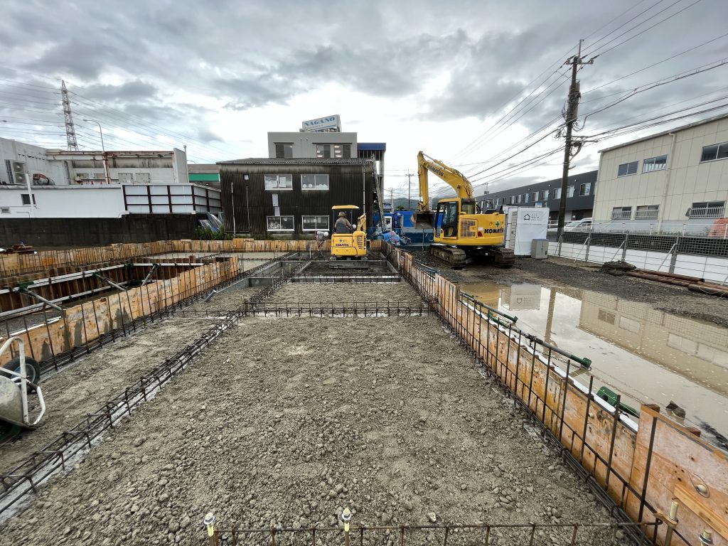 新社屋新築工事も地中梁のコンクリート打設が終了し、埋め戻し、砕石敷を施工しております。