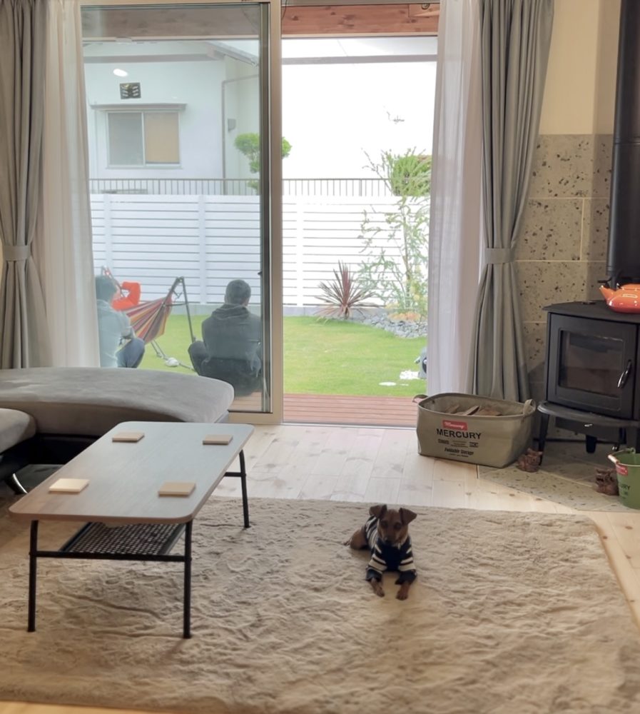 ウッドデッキとつながるお庭には天然芝が植えられていて、フェンスで囲われているのでまるでリゾートのような雰囲気が最高です。次男ことわんちゃんのピッチくんも、本当に楽しそうにのびのびと過ごしていました。こんなお家でしたらハンモックが大活躍しますね。