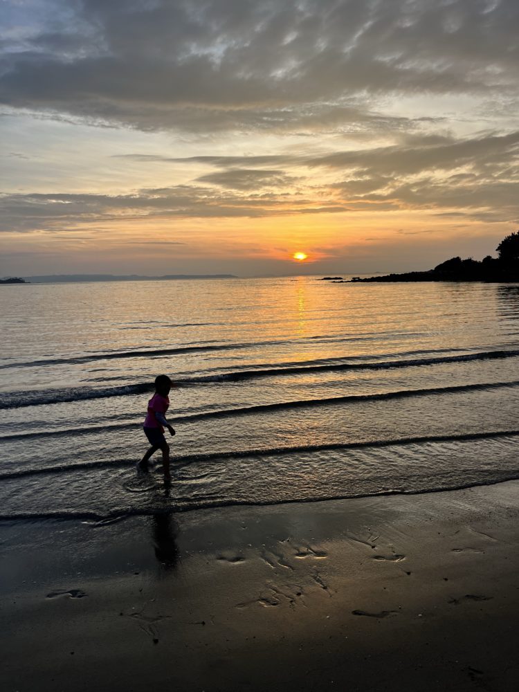 夕方散歩に行くととても綺麗なサンセットが。その中娘は洋服のまま海にダイブ🤣