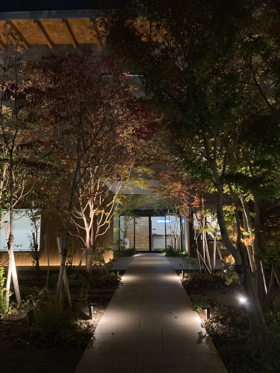 暗くなり、照明がついても綺麗なアプローチになっており、癒されます!