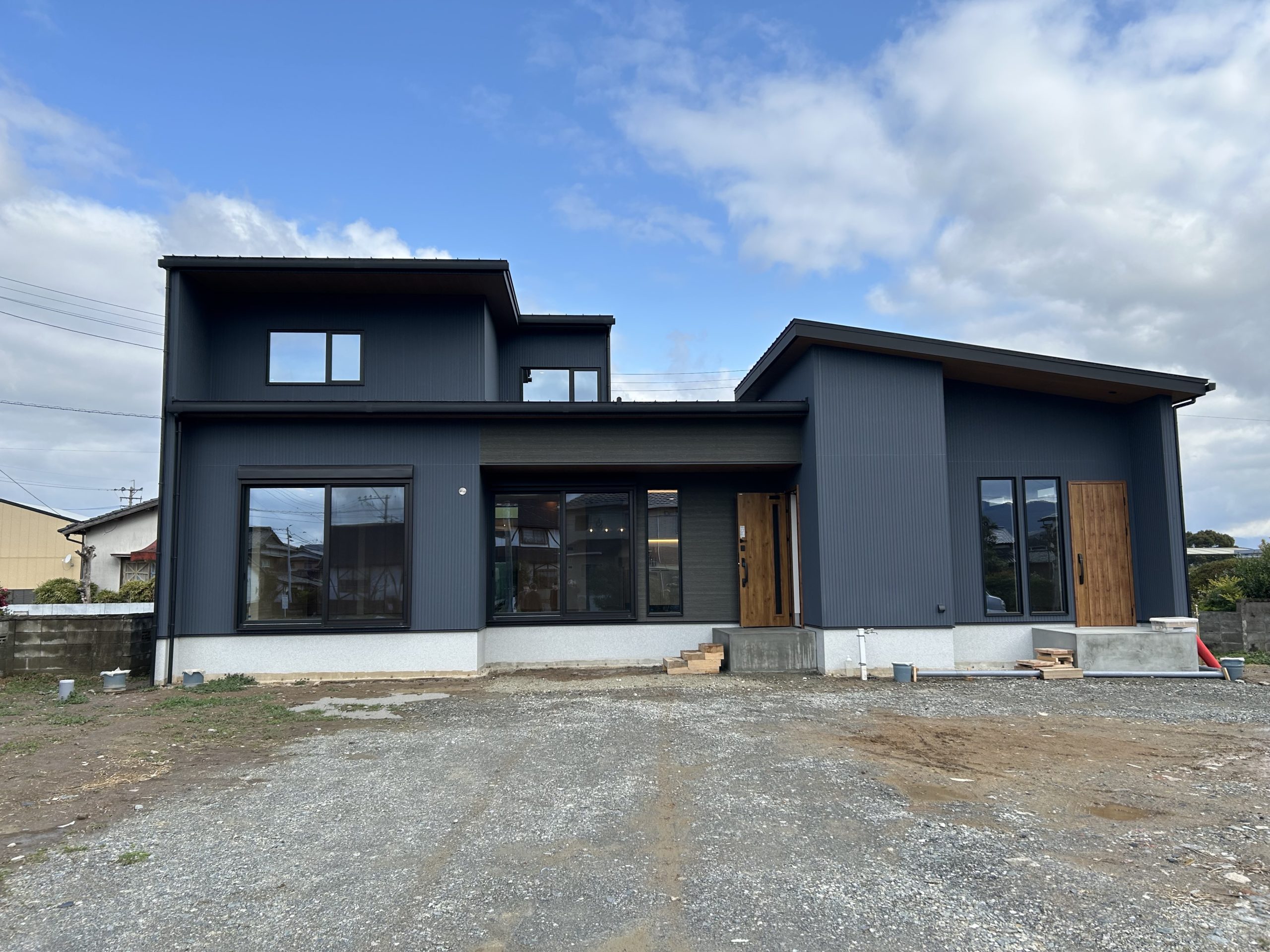 横に広いファサードで、ネイビーを基調に、シックな色の木目をアクセントにした外観です。またご夫婦がそれぞれにご要望頂いた、フラットな屋根の形状と、屋根らしい斜めの形状の外観を両立させました。