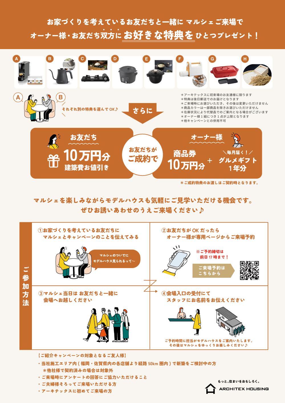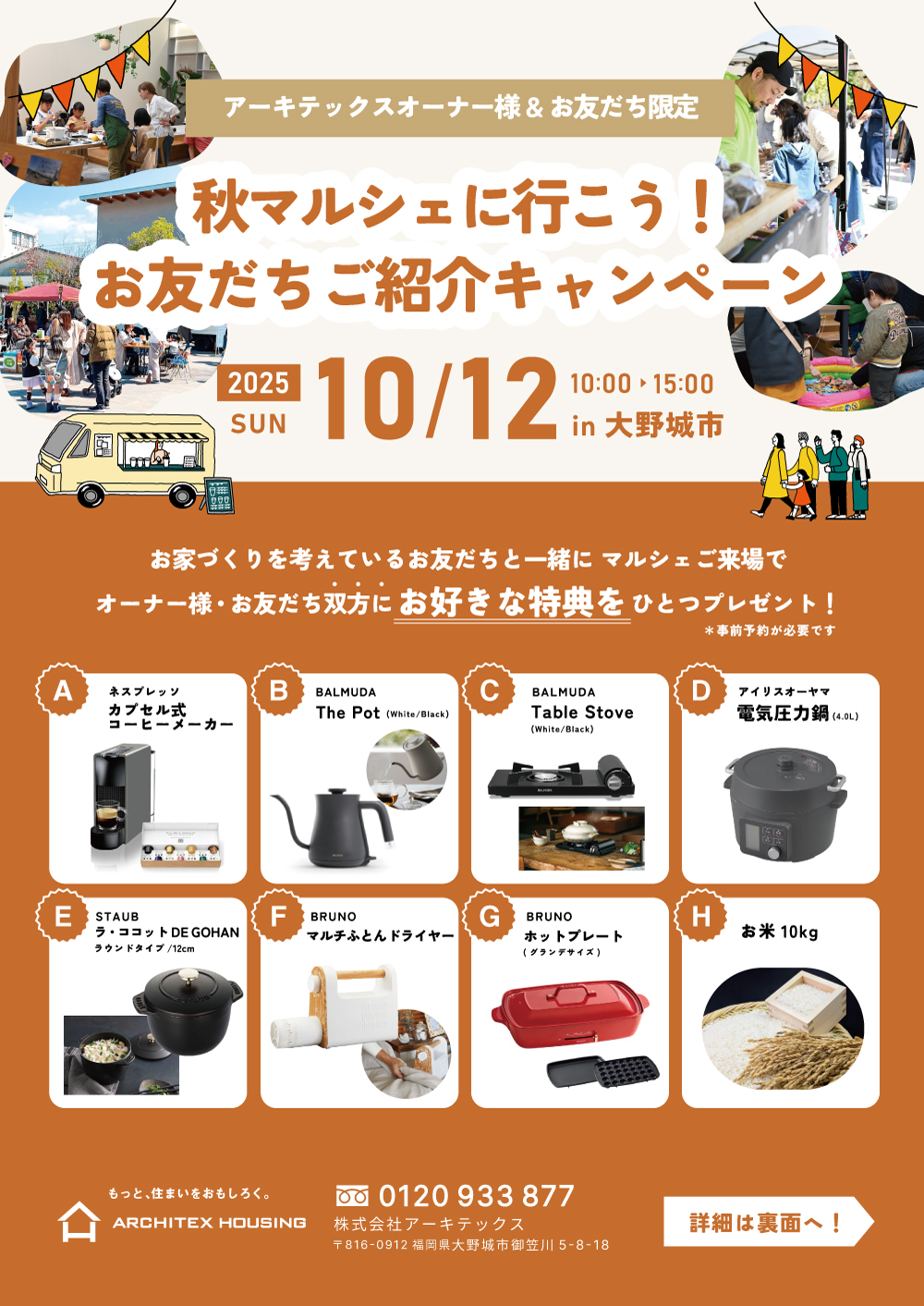 10/12(日)に開催される秋マルシェへ、お家づくりを考えているお友だちと一緒にご来場いただくと選べる豪華特典をそれぞれにプレゼント◎
