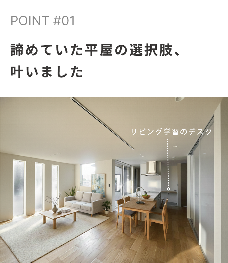 「平屋に憧れるけど、予算・間取り的に厳しいから2階建てかな」と、当初2階建てを考えていたオーナー様。でも実はお打合せをしていくなかで、間取り・予算のどちらも妥協することなく平屋が建てられる!と方向転換されたんです。「平屋=高い」「自分たちには平屋は無理」と思っている方こそ、ぜひお越しください。