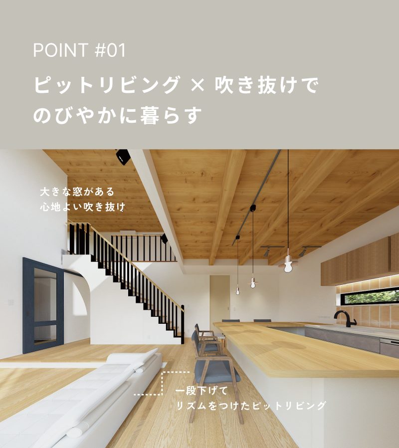 単純な広さではなく、リズムと縦の広がりで満足感のあるリビング空間。フロアを一段下げたピットリビングは、地面に近いくつろぎの姿勢で過ごす憩いの場。吹き抜けにある大きな2つの窓から心地よい光が入ります。