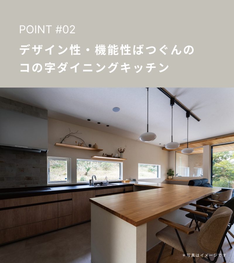 壁付けキッチン+L字カウンターでコの字型に仕上げたダイニングキッチン。キッチン側は1段下げることで調理する人は立ったままで、カウンターに座る人はハイチェアではなく通常の椅子でちょうどいいバランスに。カウンター下には収納も隠せるので機能性も◎アクセントにあしらった壁のタイルにも注目。