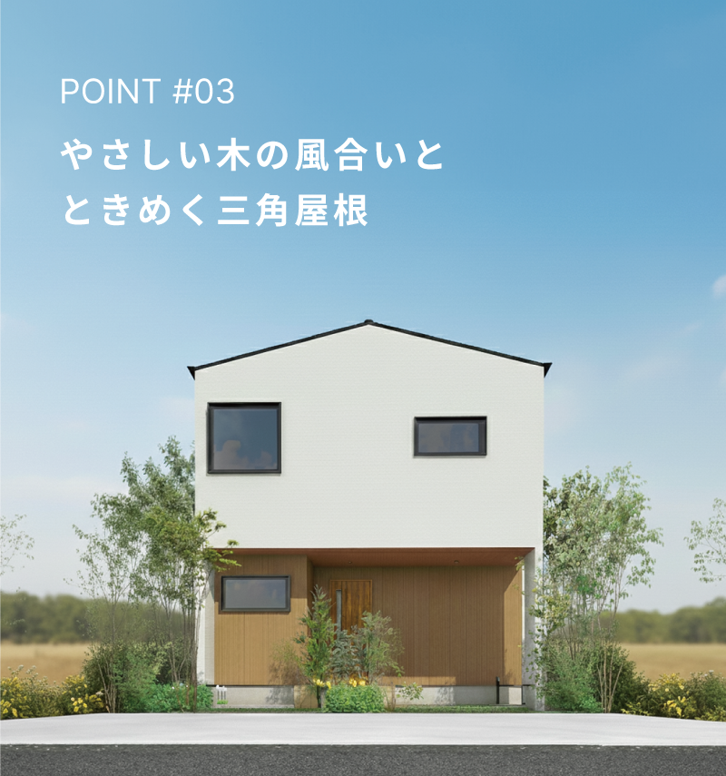 外観は三角屋根に白と木目のサイディング貼り分けが印象的。室内は梁を見せるなど、木のやさしい風合いを感じられるほっと落ち着く空間になりました。