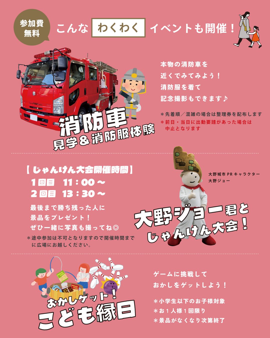 今回も素敵な19の店舗様をお招きいたします。さらになんと、アーキテックス初となる「消防車見学&消防服体験」に、大野城市民ならみんな知っている「大野ジョーくん」がやってきます!
